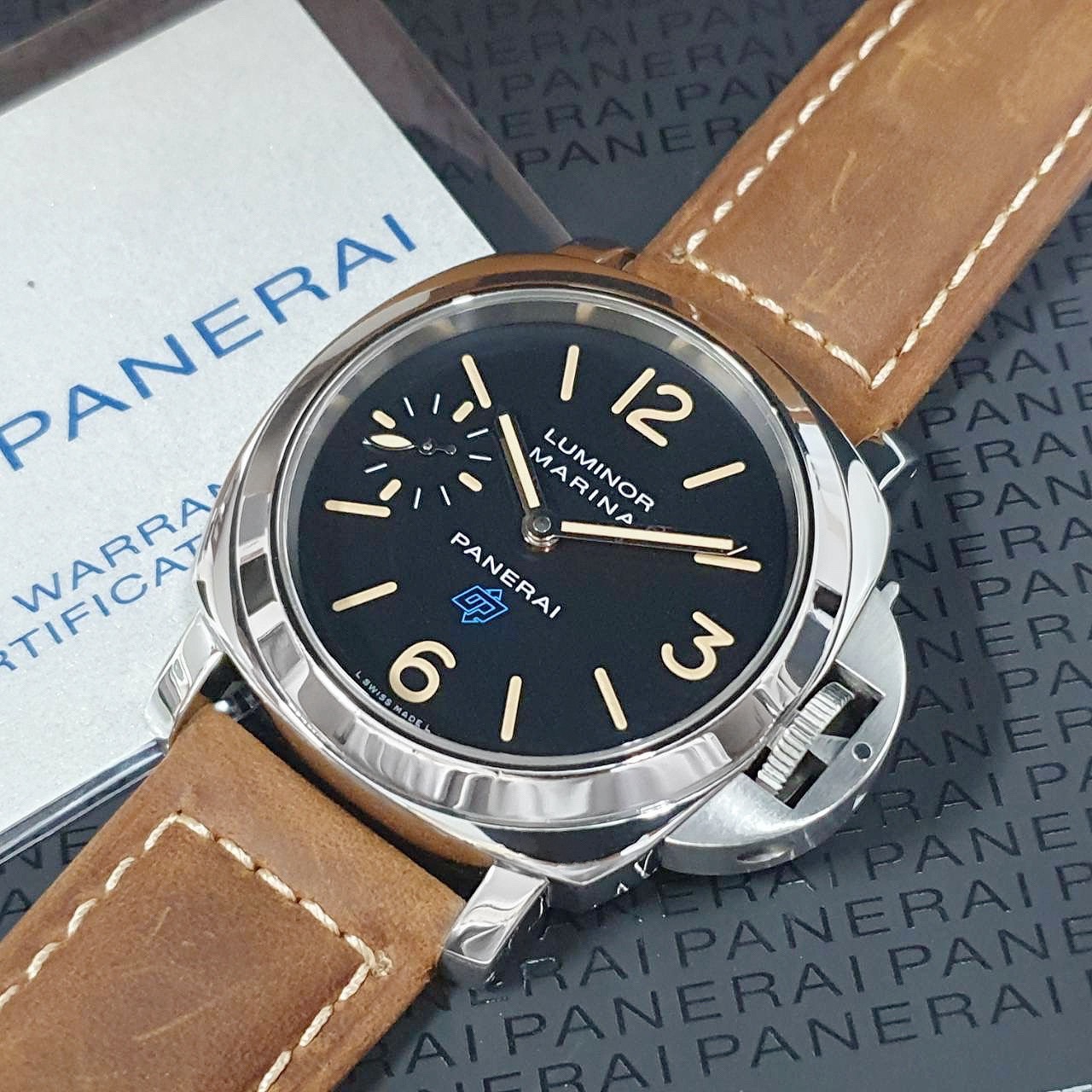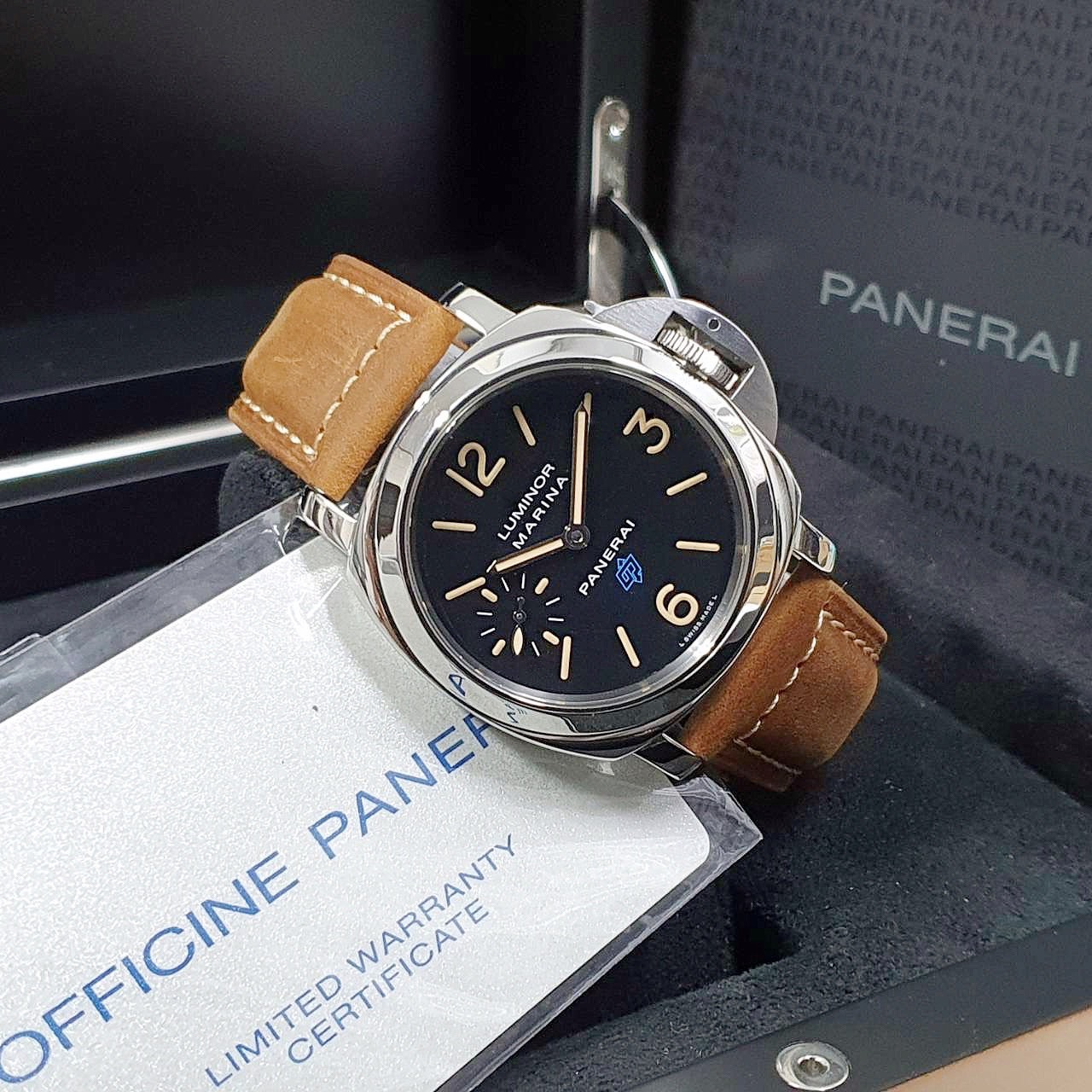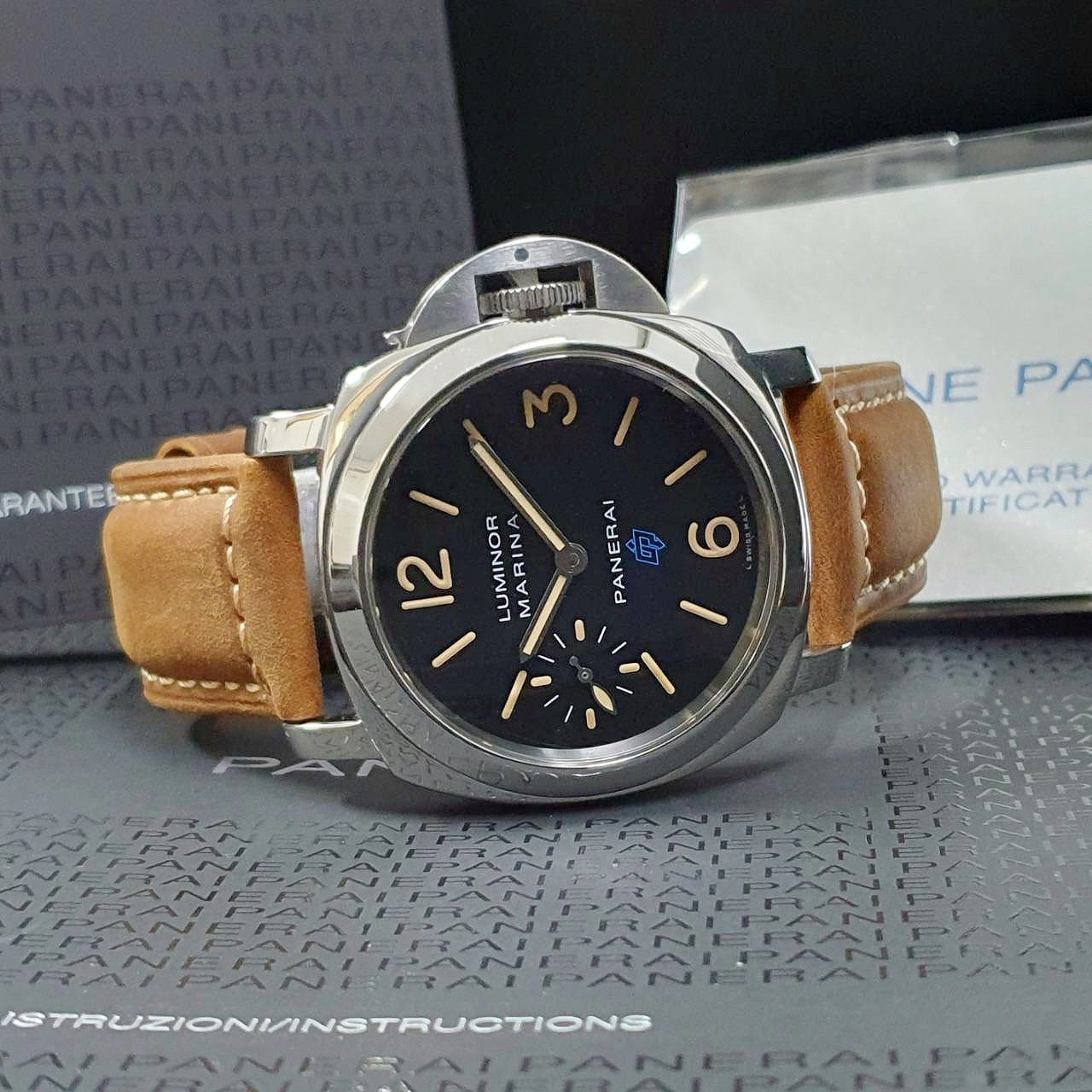 PANERAI沛納海 PAM00631 黑色面盤 菸草色時標 2017/09 小秒針 龍頭護橋 原廠扣 代用皮革錶帶 錶徑44mm 手動上鍊 不鏽鋼材質 防水100米 原廠盒單齊全 保養完成