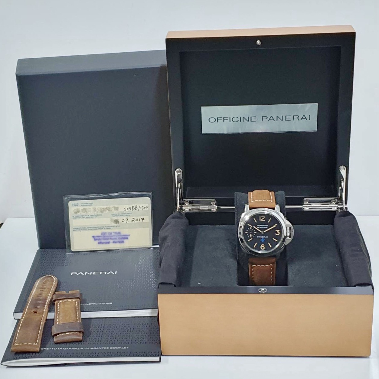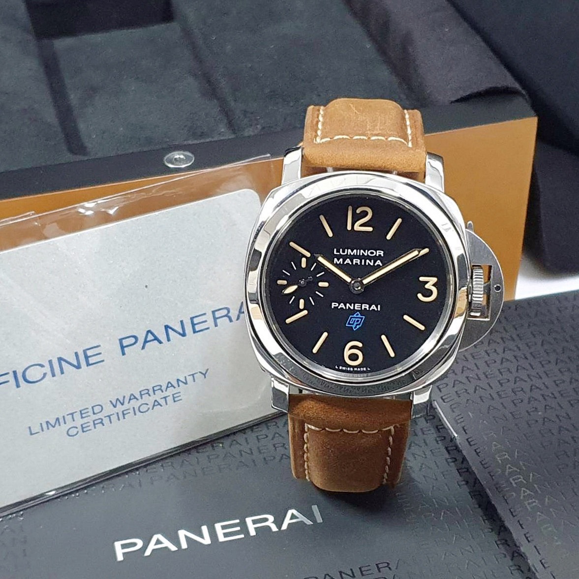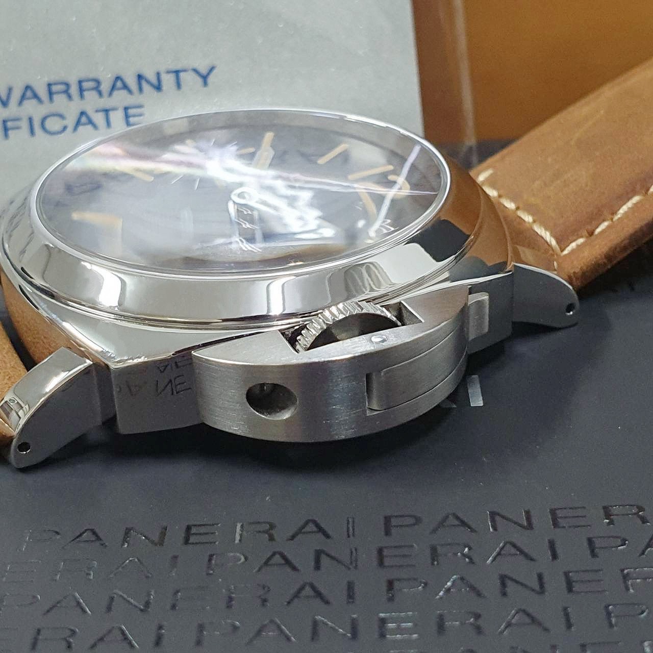 PANERAI沛納海 PAM00631 黑色面盤 菸草色時標 2017/09 小秒針 龍頭護橋 原廠扣 代用皮革錶帶 錶徑44mm 手動上鍊 不鏽鋼材質 防水100米 原廠盒單齊全 保養完成