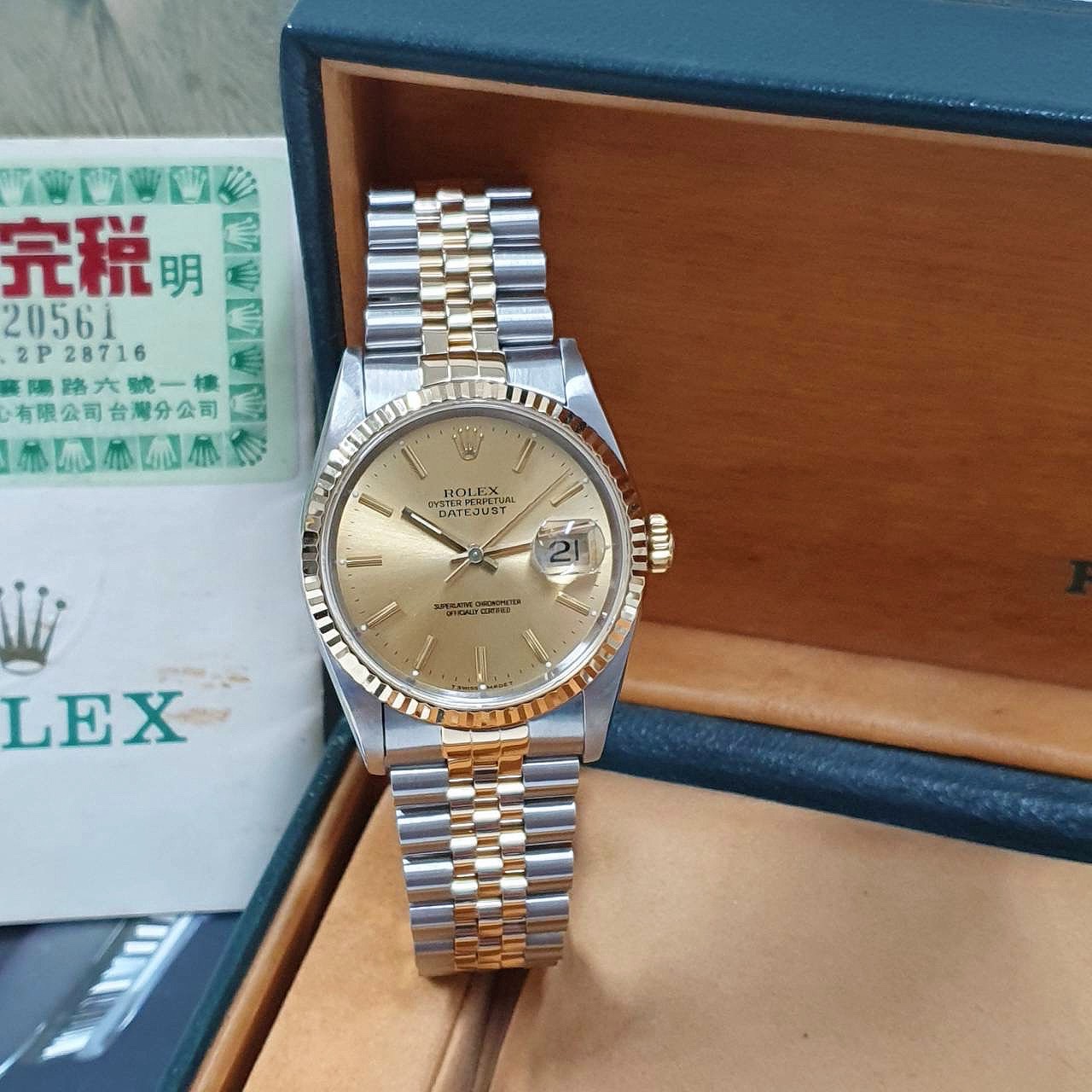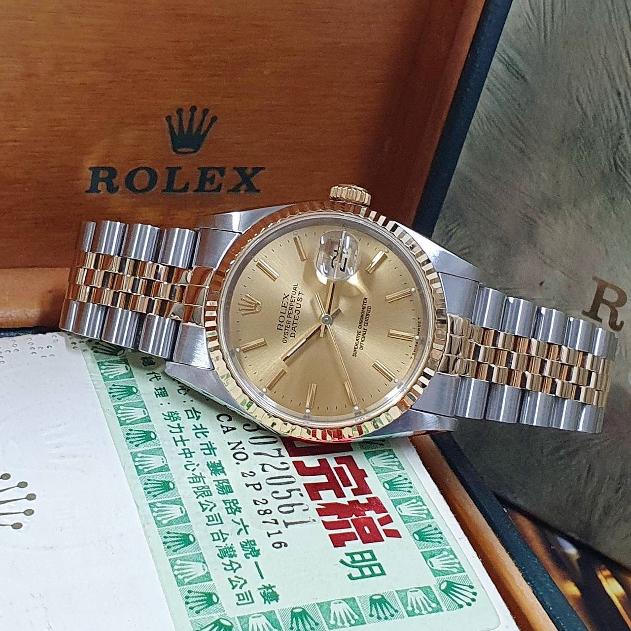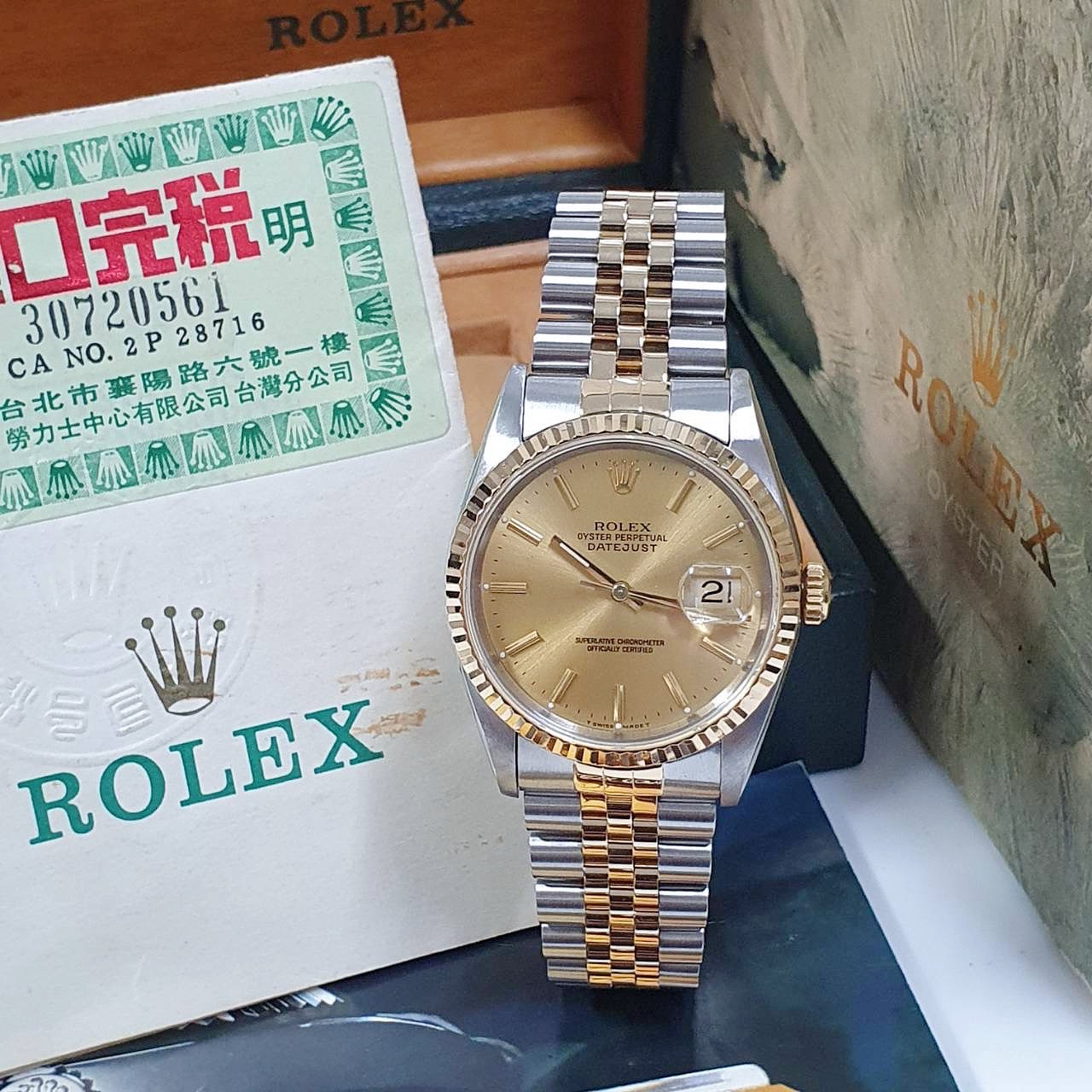 ROLEX勞力士 16233 Datejust 蠔式日誌 金面T柱 台灣AD 錶徑36mm 自動上鍊 18K金及不鏽鋼 防水100米 X字頭 原廠盒單齊全 保養完成