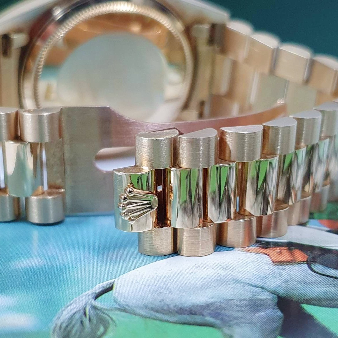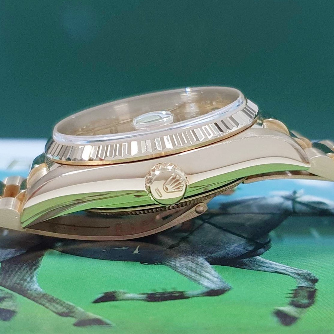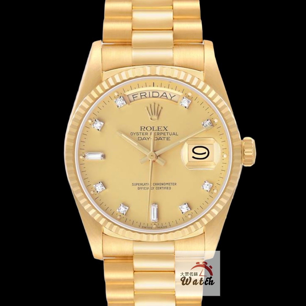 18K黃金材質錶殼、元首型鏈帶、折疊錶扣 / 金色面盤鑽石時標6.9T鑽 / 藍寶石玻璃水晶玻璃 |
