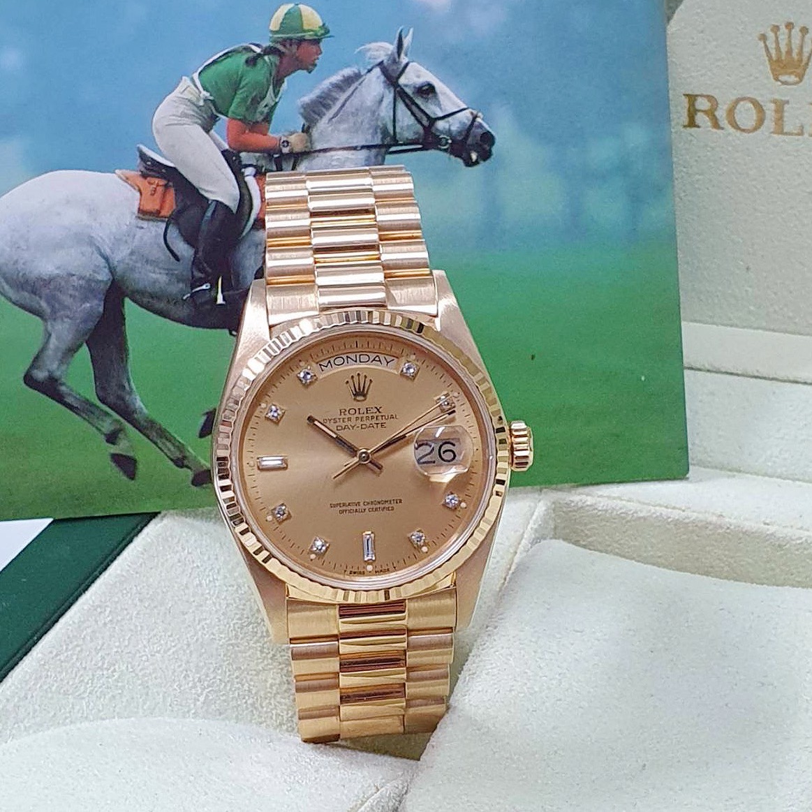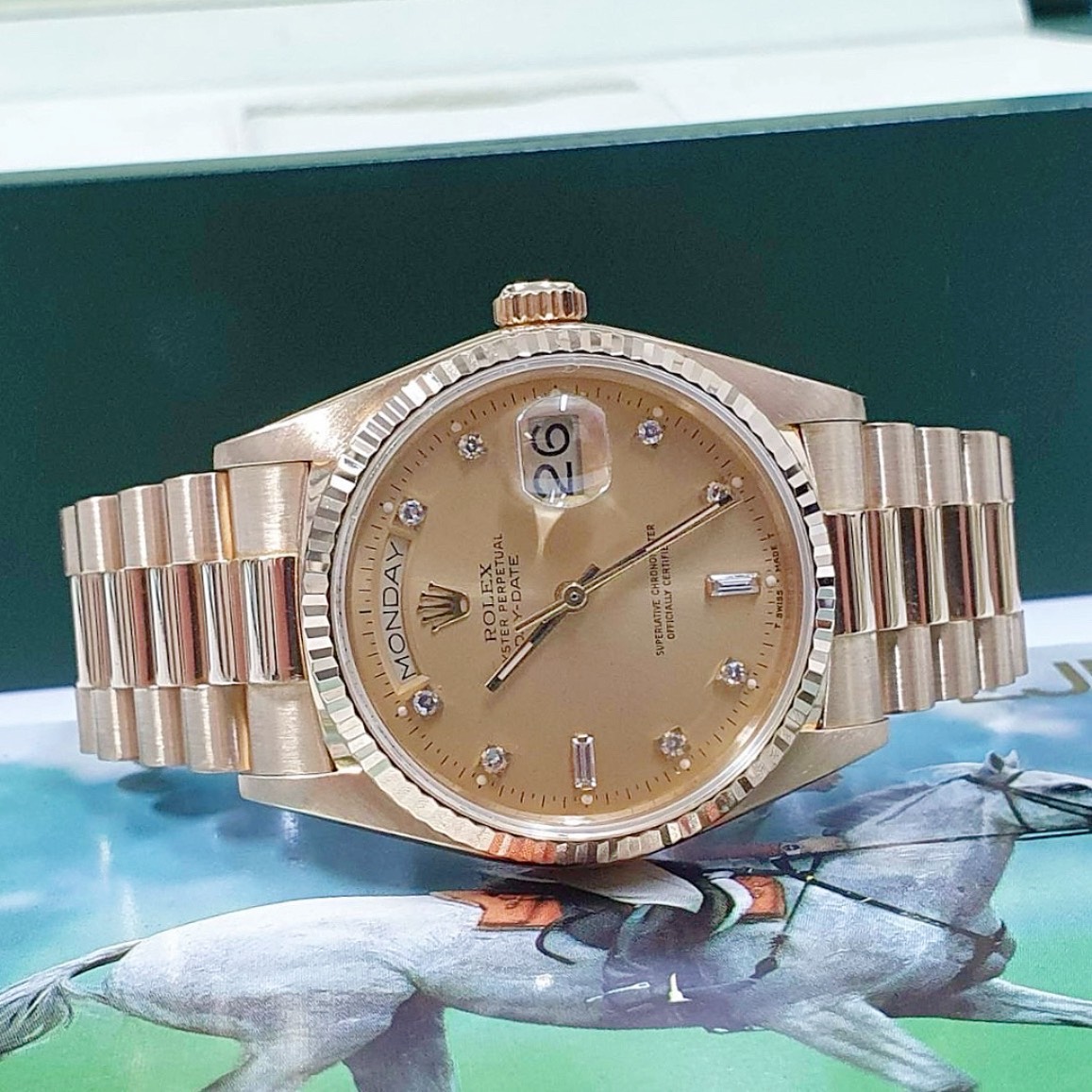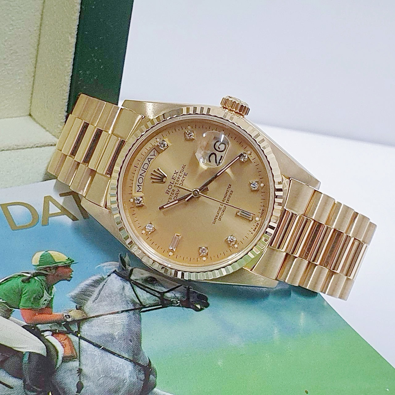 ROLEX 勞力士 18038 Day-date 蠔式18K金 金十鑽面盤 6.9T鑽 錶徑36mm 自動上鍊 18K金材質 防水100米 900萬字頭 缺證書 原廠盒裝 店保卡 保養完成