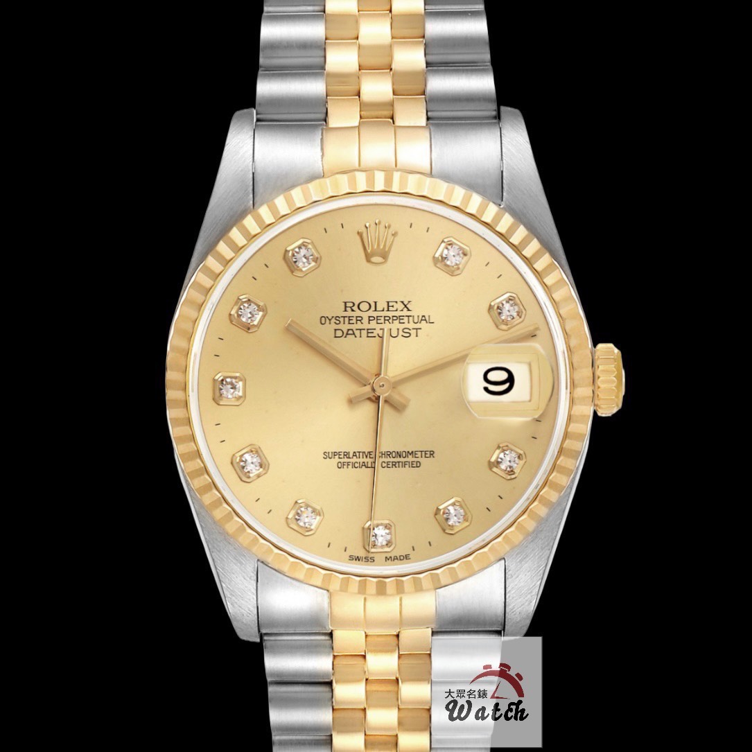 ROLEX勞力士 16233 Datejust 蠔式日誌 金十鑽面盤 新包台 錶徑36mm 自動上鍊 18K金及不鏽鋼 防水100米 T字頭 缺證書 原廠盒裝 店保卡 保養完成