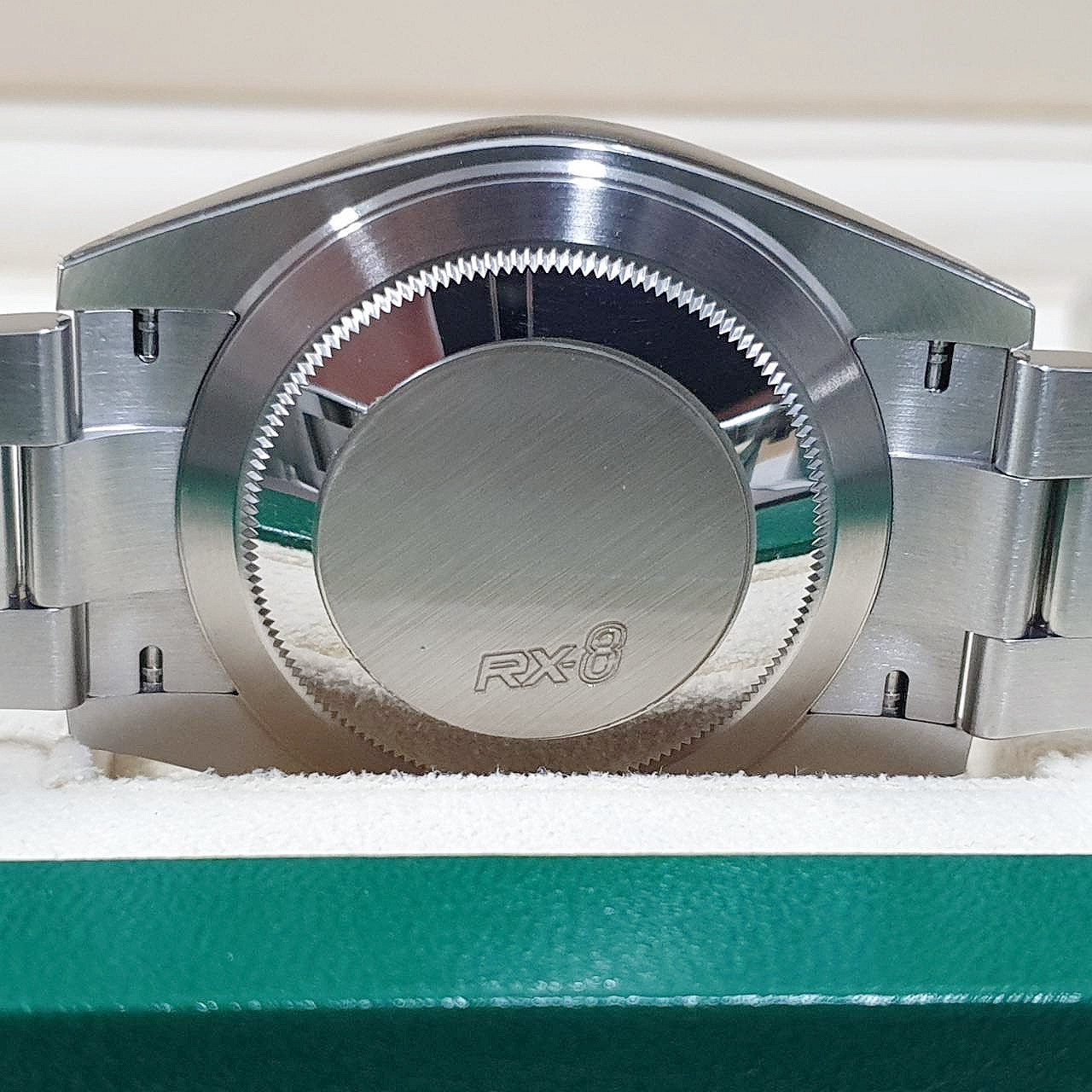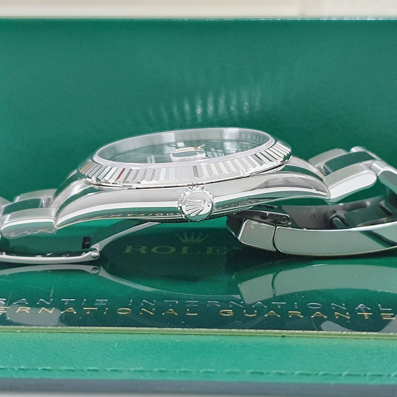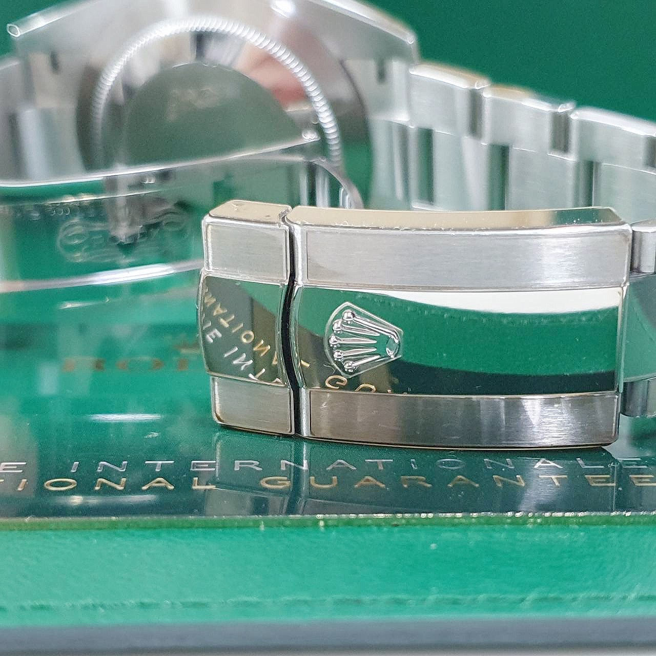 18K白金三角坑紋錶框 / 904L不鏽鋼材質錶殼、錶帶、摺疊扣、旋入式錶冠 / 灰色面盤、夜光指針、綠色羅馬時標 / 藍寶石水晶玻璃 / 防偽內圈 |