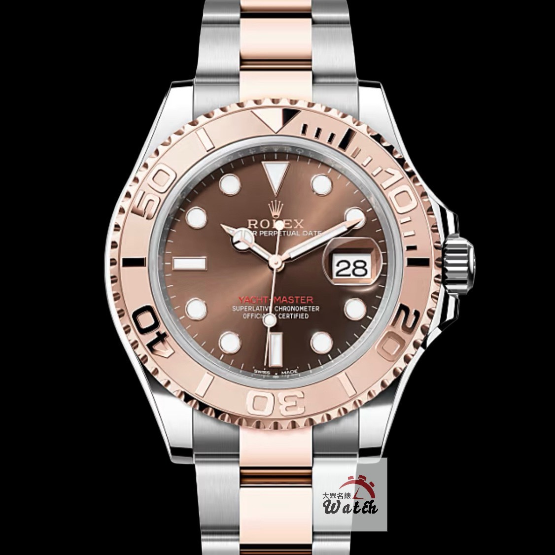 不鏽鋼材質錶殼 / 玫瑰金材質雙向旋轉錶圈、旋入式錶冠 / 玫瑰金半金錶鍊帶及蠔式折疊帶扣 / 巧克力色放射紋面盤 / 夜光時標及賓士指針 / 藍寶石水晶玻璃鏡面 |