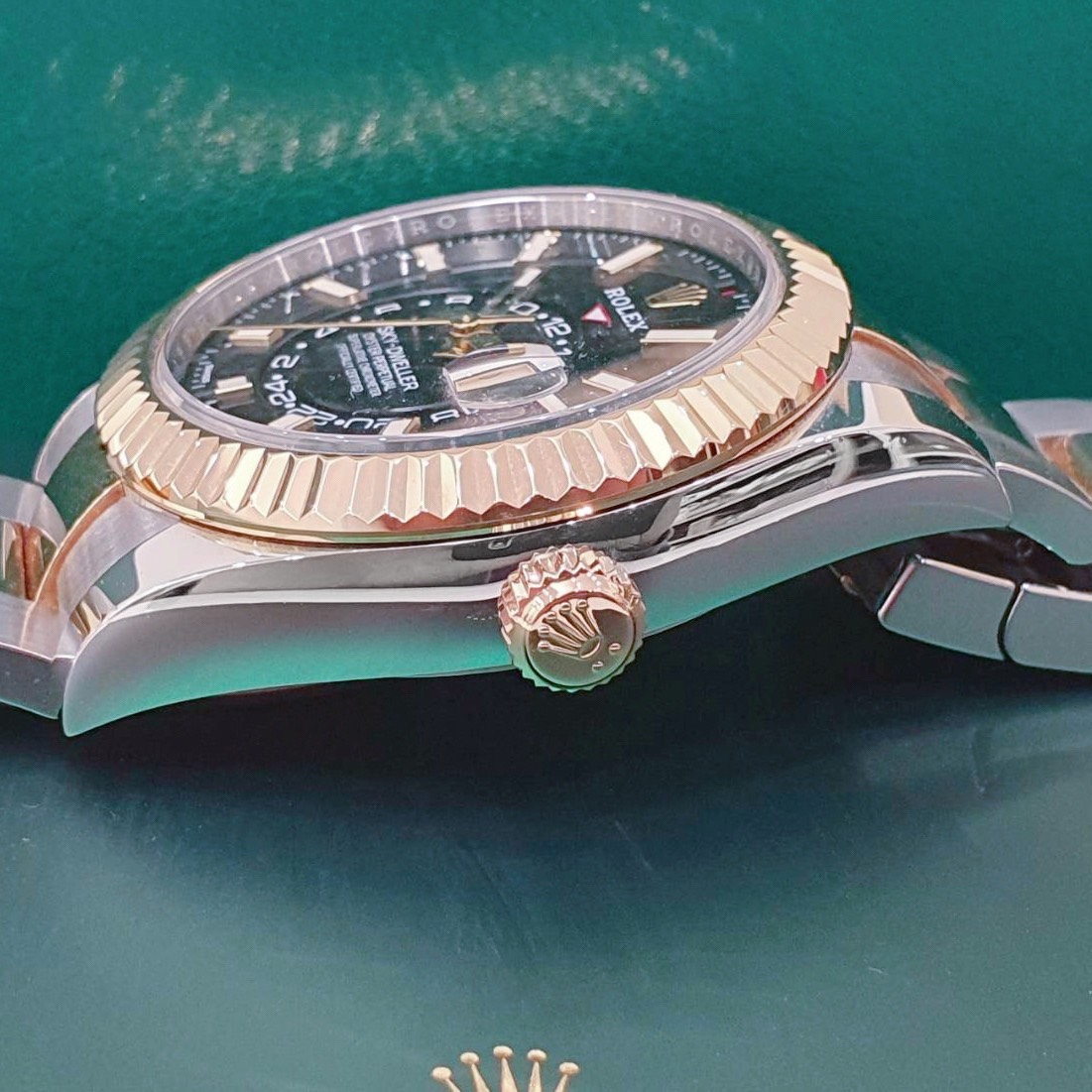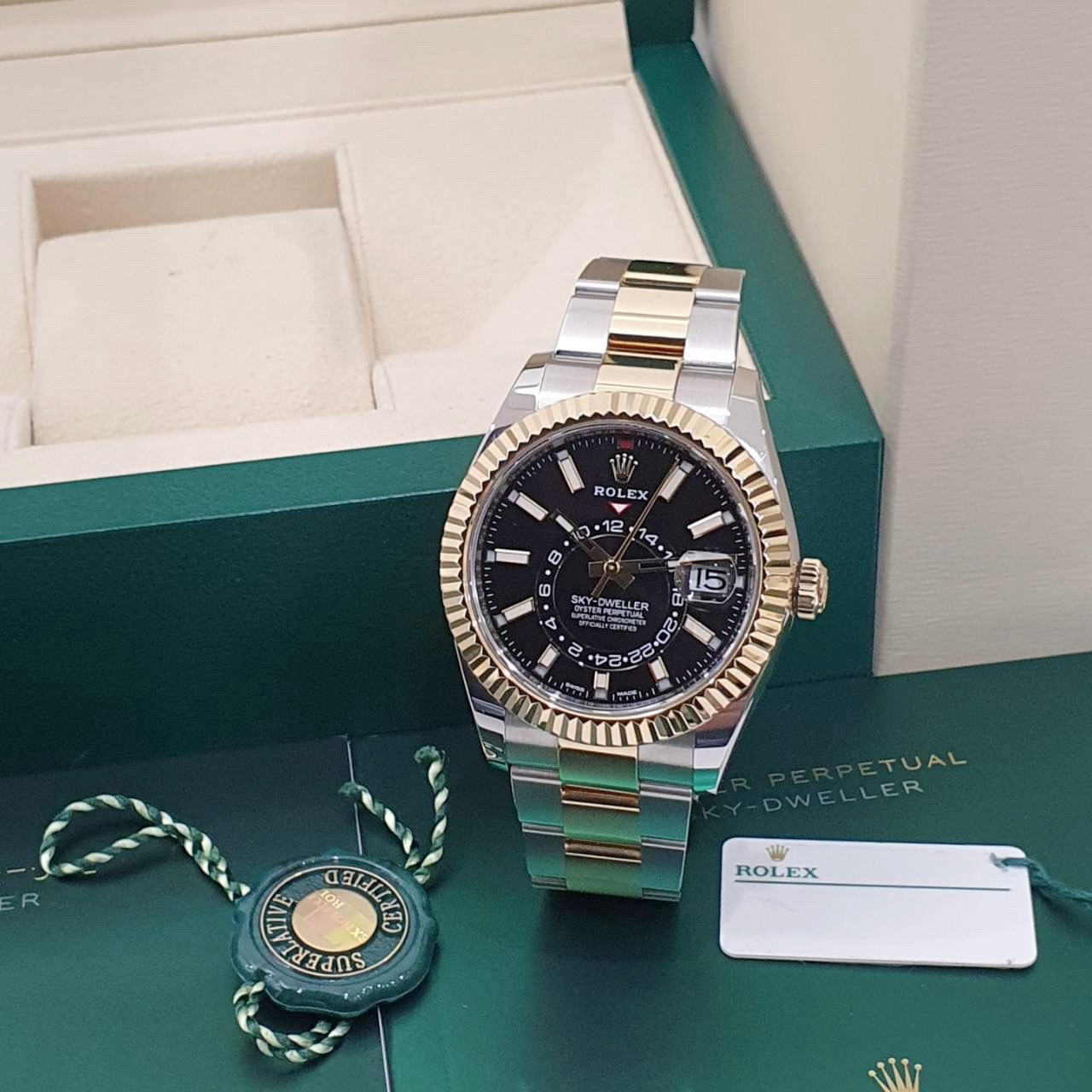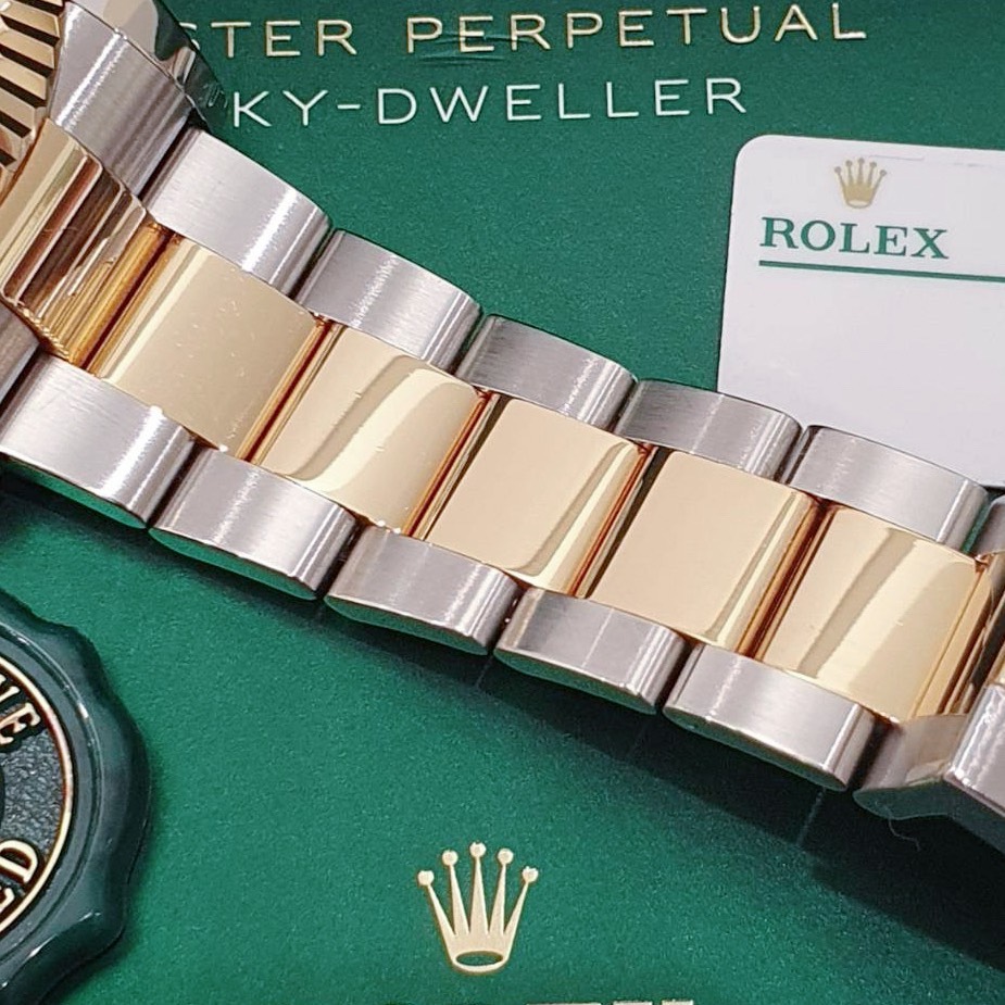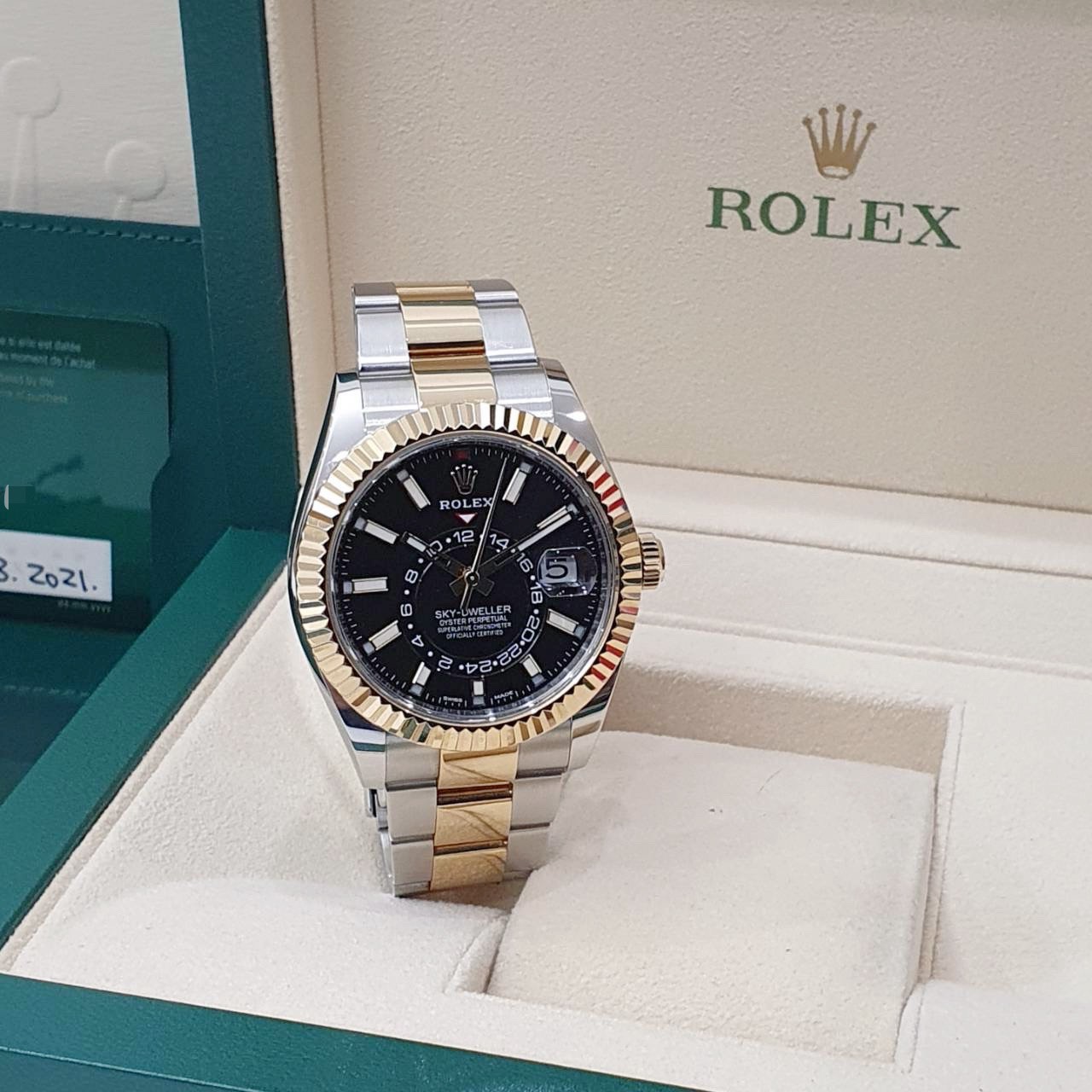 ROLEX 勞力士 326933 Sky-Dweller 天行者 2021/02全配件 半金天行者 黑色面盤 三版帶 年曆功能 月份顯示 兩地時區 錶徑42mm 自動上鍊 18K金及不鏽鋼 防水100米 原廠全配件
