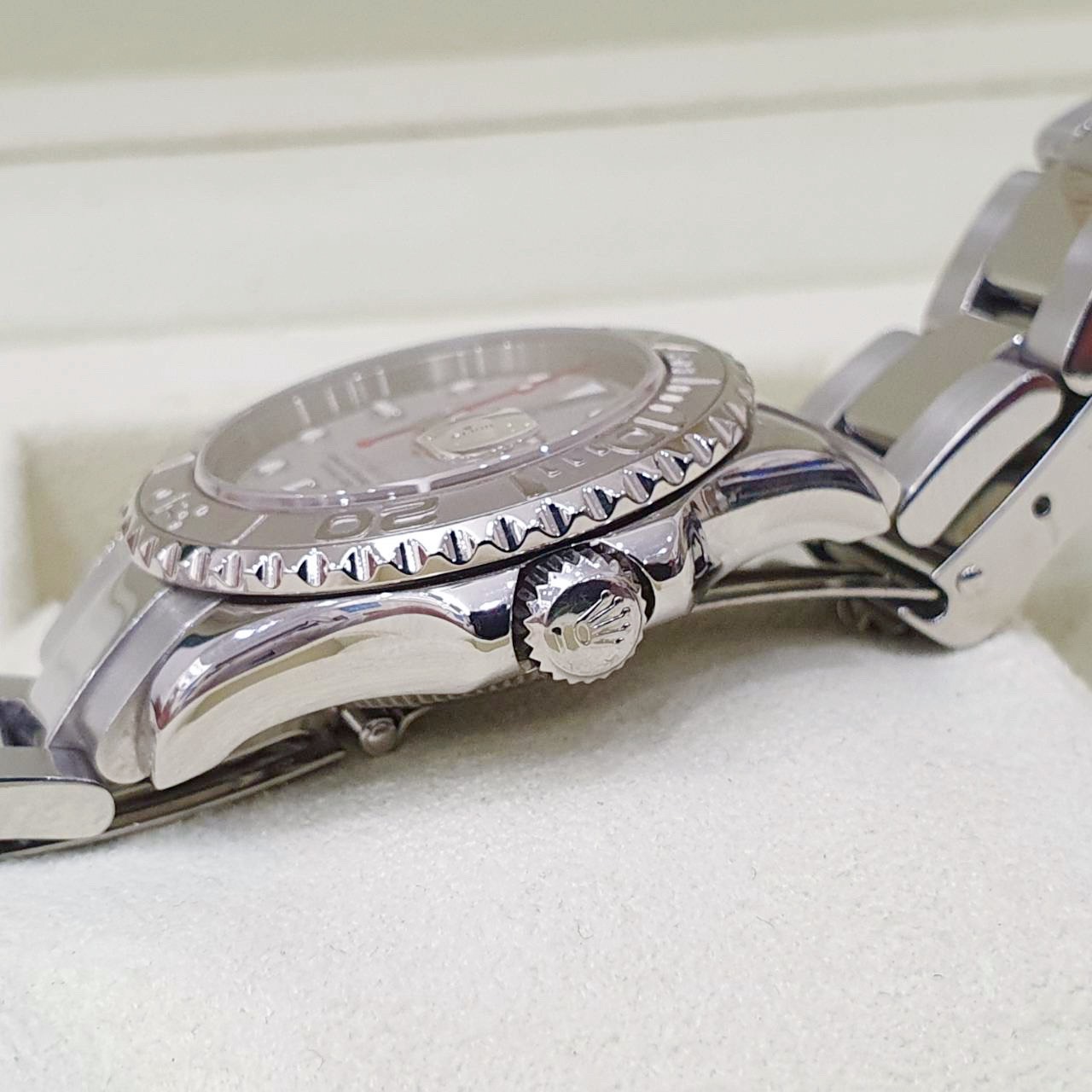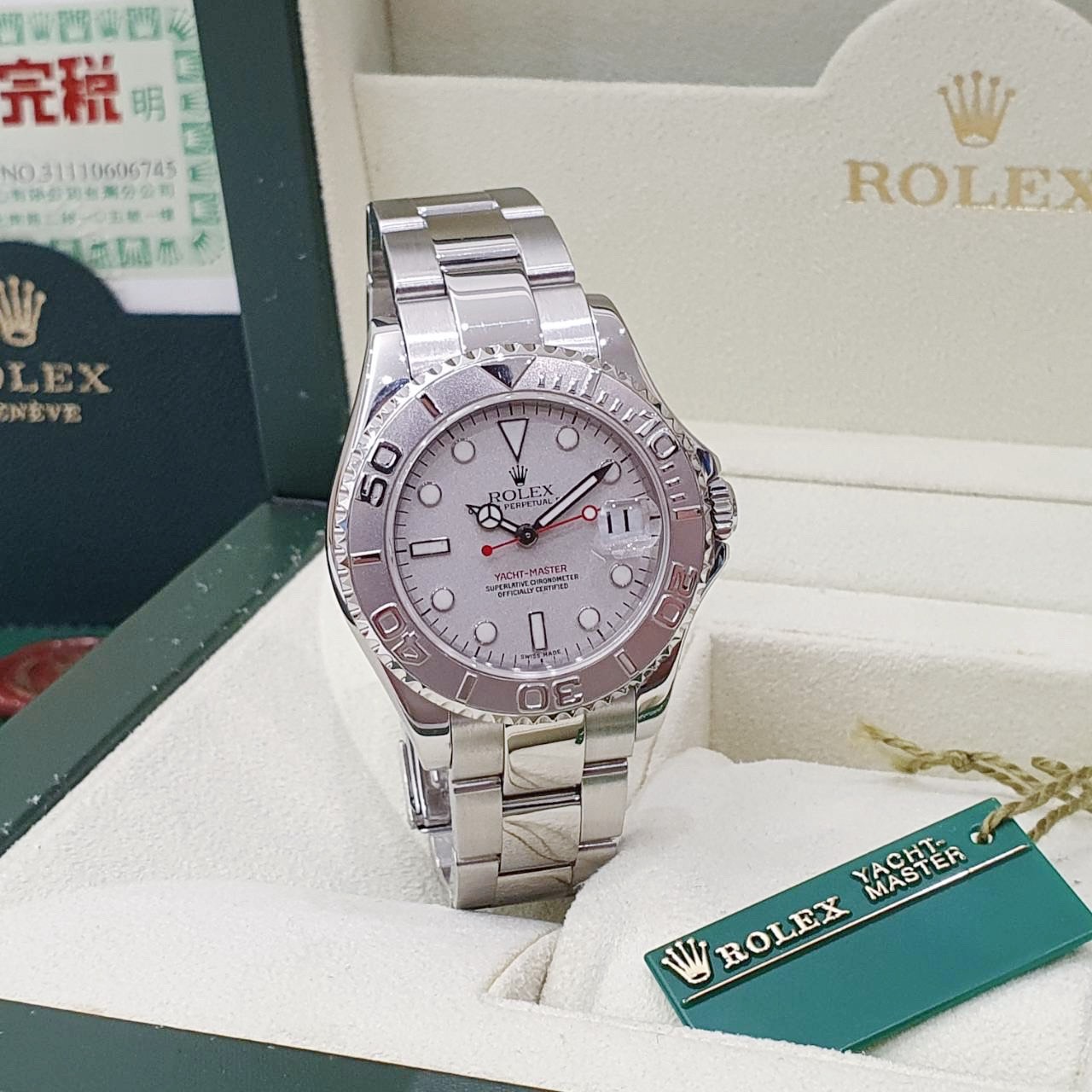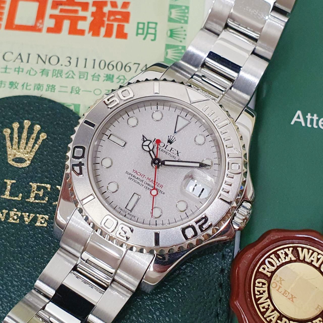 ROLEX 勞力士 Yacht-Master 168622 中遊艇 2003/06台灣AD 灰面紅針 鉑金錶圈噴砂面 錶徑35mm 自動上錬 不銹鋼材質 防水100米 原廠盒單齊全 保養完成