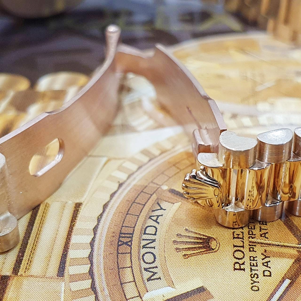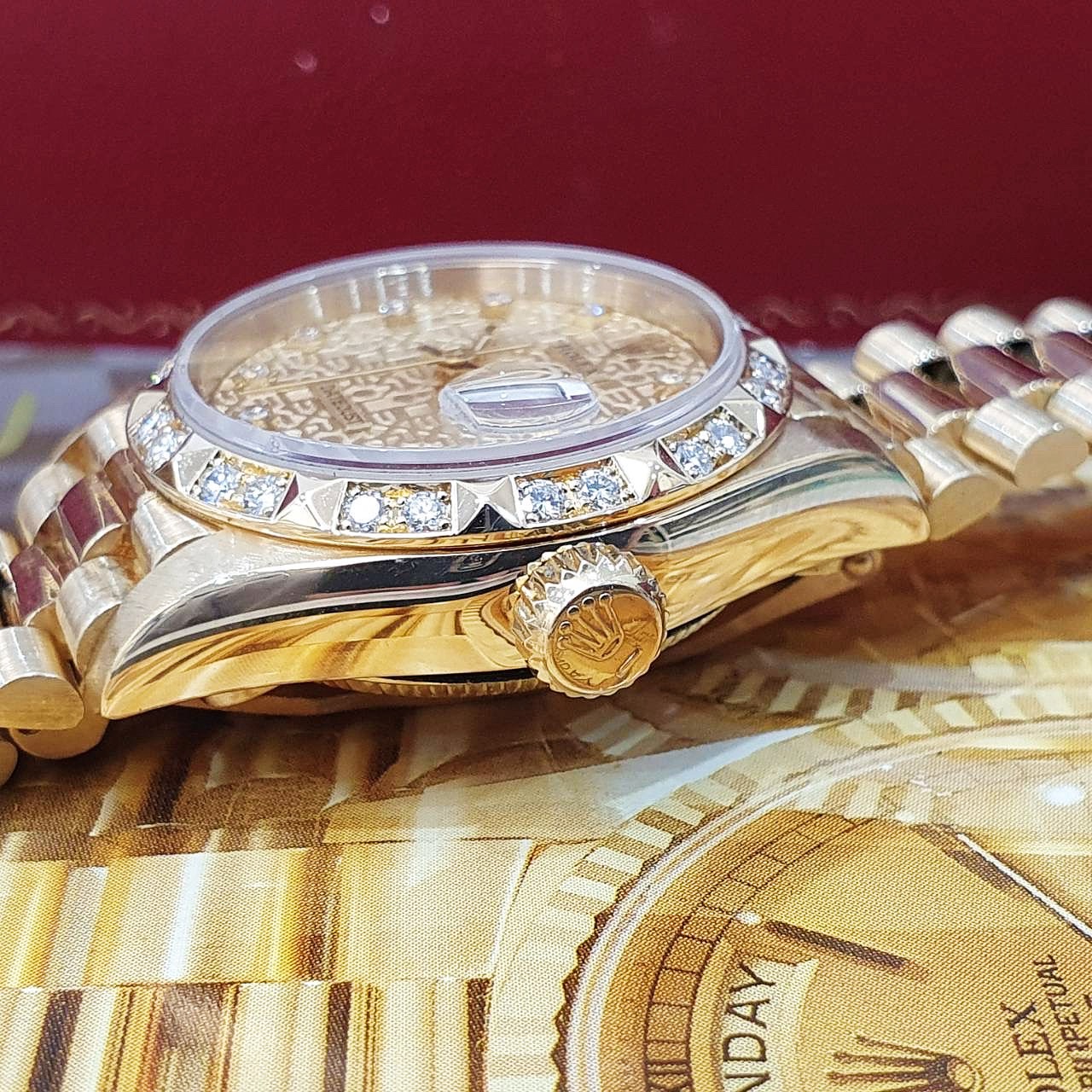 18K黃金材質錶殼、錶鍊帶及單邊折疊帶扣 / 金十鑽紀念面 / 原鑲金字塔鑽框 / 旋入式錶冠 / 藍寶石水晶玻璃鏡面 |