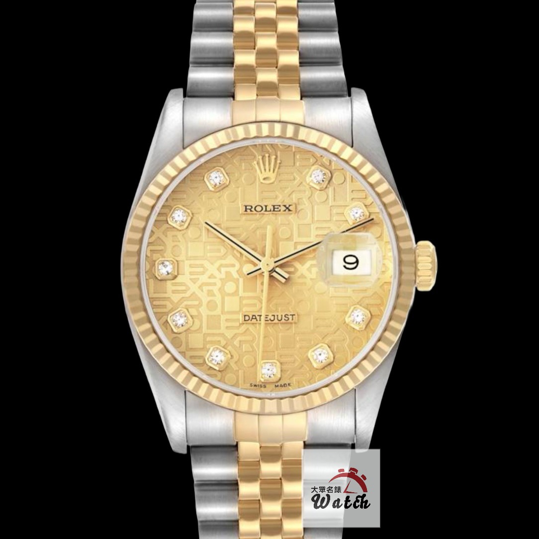 ROLEX 勞力士 16233 Datejust 經典太陽圈 新包台 金色十鑽紀念面盤 錶耳無孔 錶徑36mm 自動上鍊 18K金及不鏽鋼 防水100米 K字頭 缺證書 原廠盒裝 保養完成