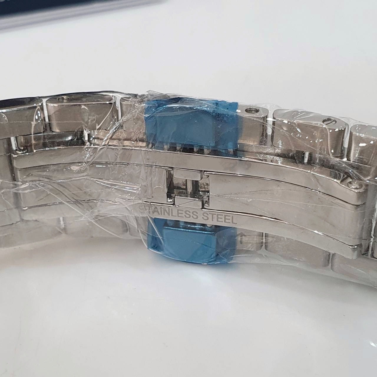 不鏽鋼材質錶殼、鏈帶及折疊帶扣 / 麥粒飾紋黑色羅馬面盤 / 藍寶石水晶玻璃鏡面及透明錶背 |