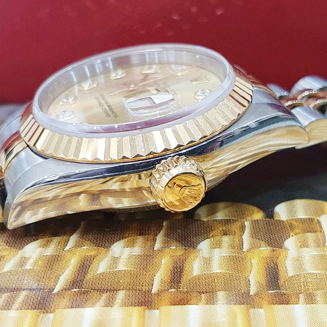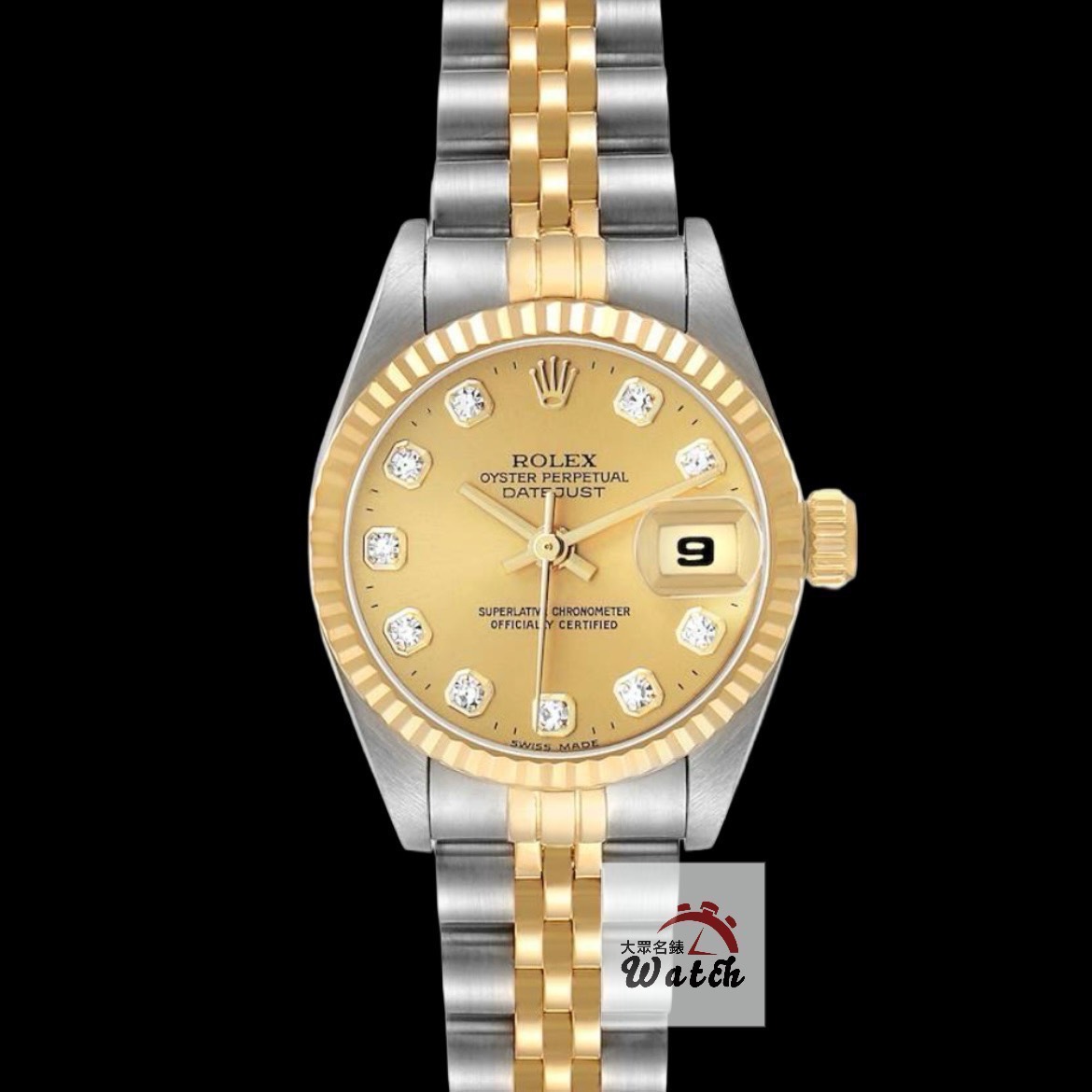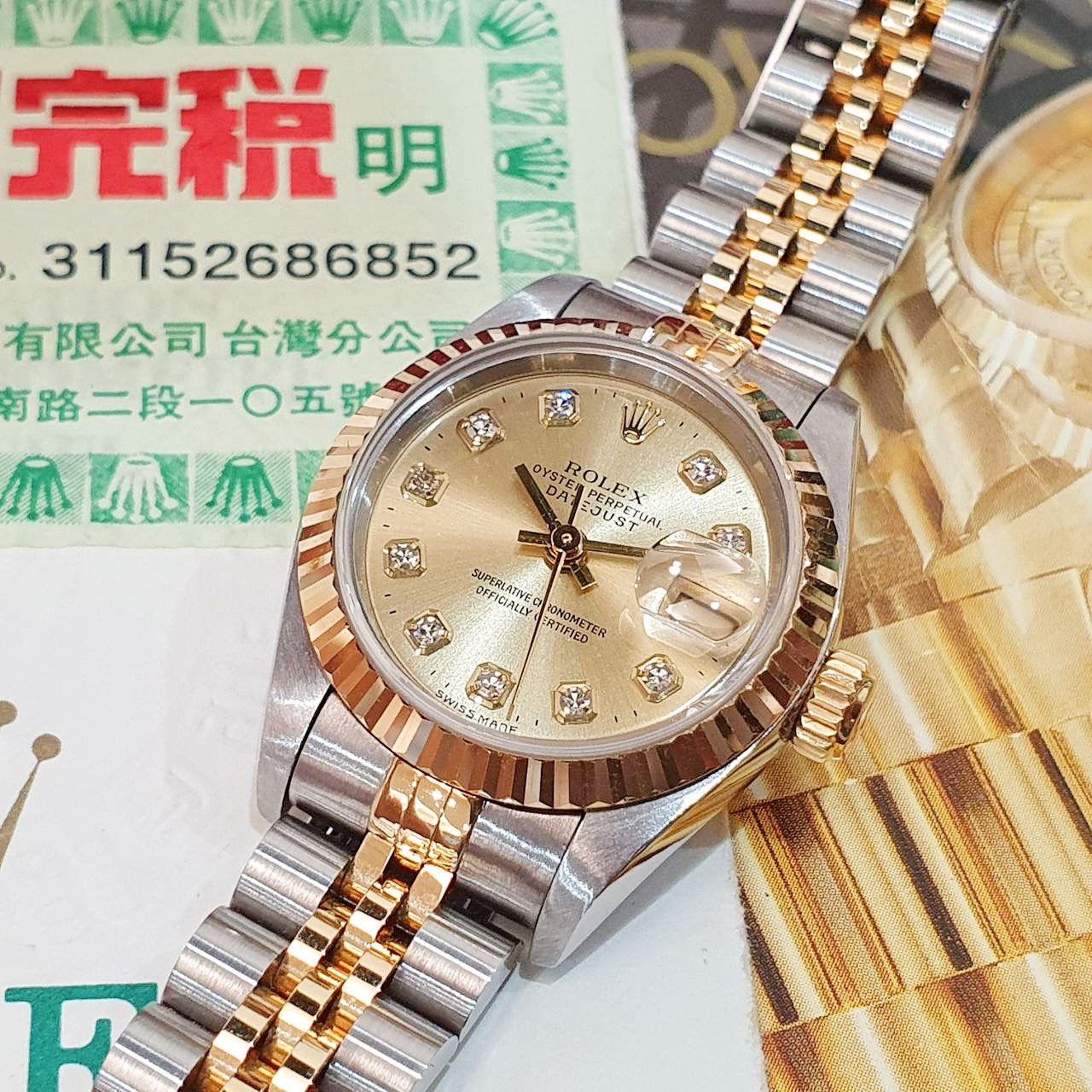 ROLEX勞力士69173 Datejust 蠔式女錶 經典太陽圈 新包台 金色十鑽面盤 台灣公司貨 錶徑26mm 自動上鍊 18K金及不銹鋼 防水100米 W字頭 原廠盒單齊全 保養完成